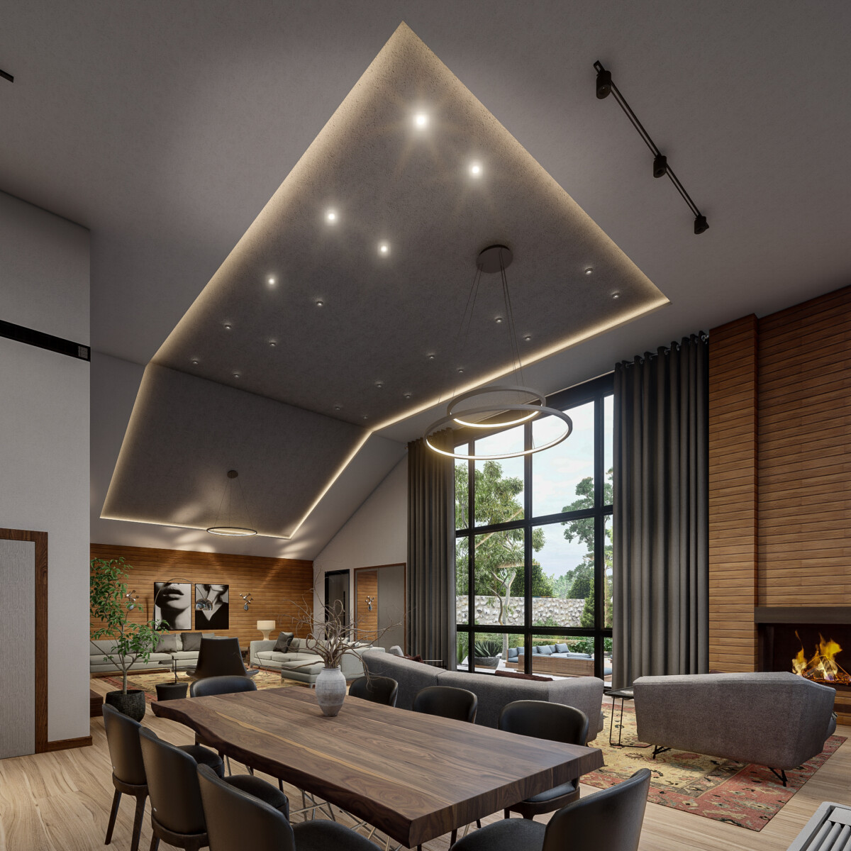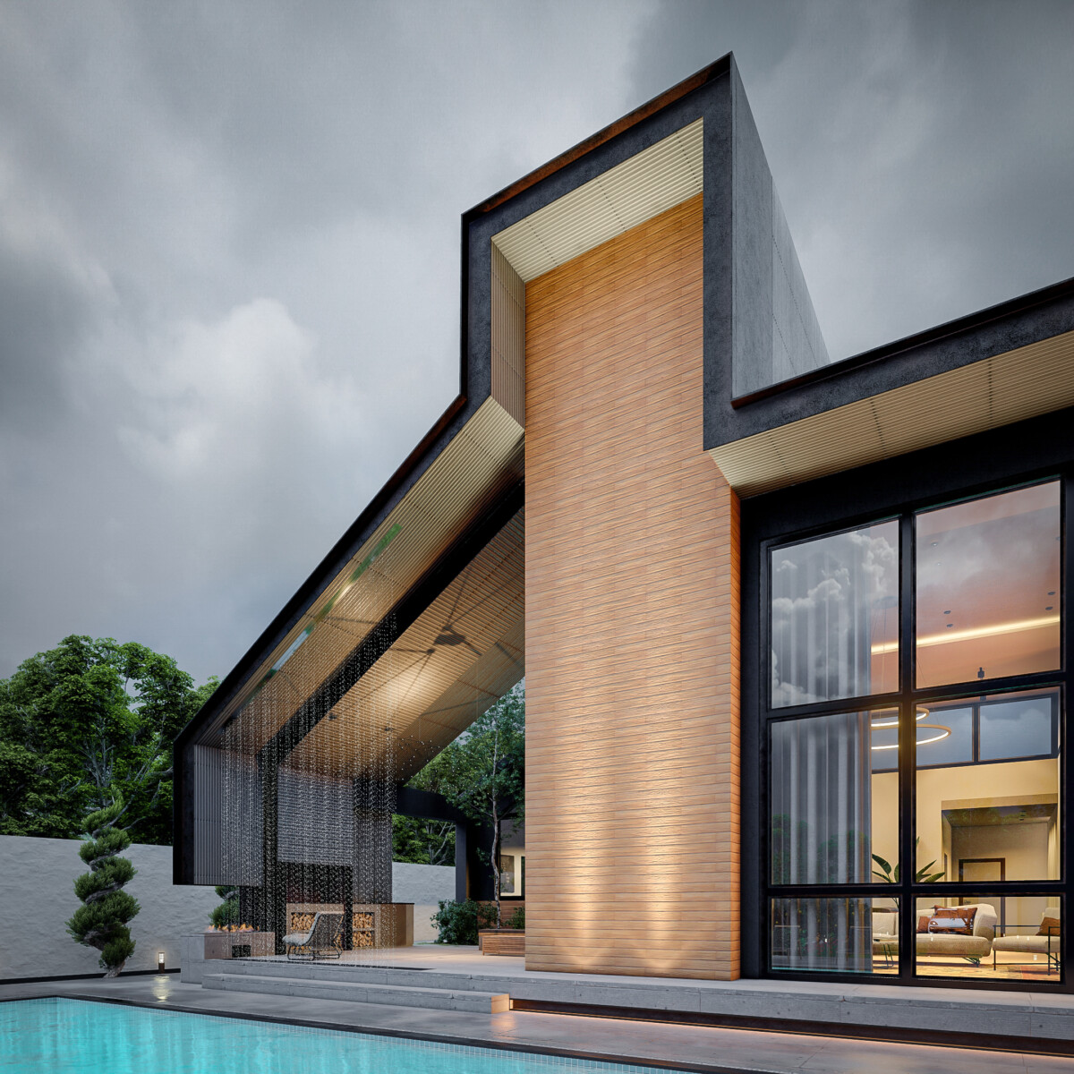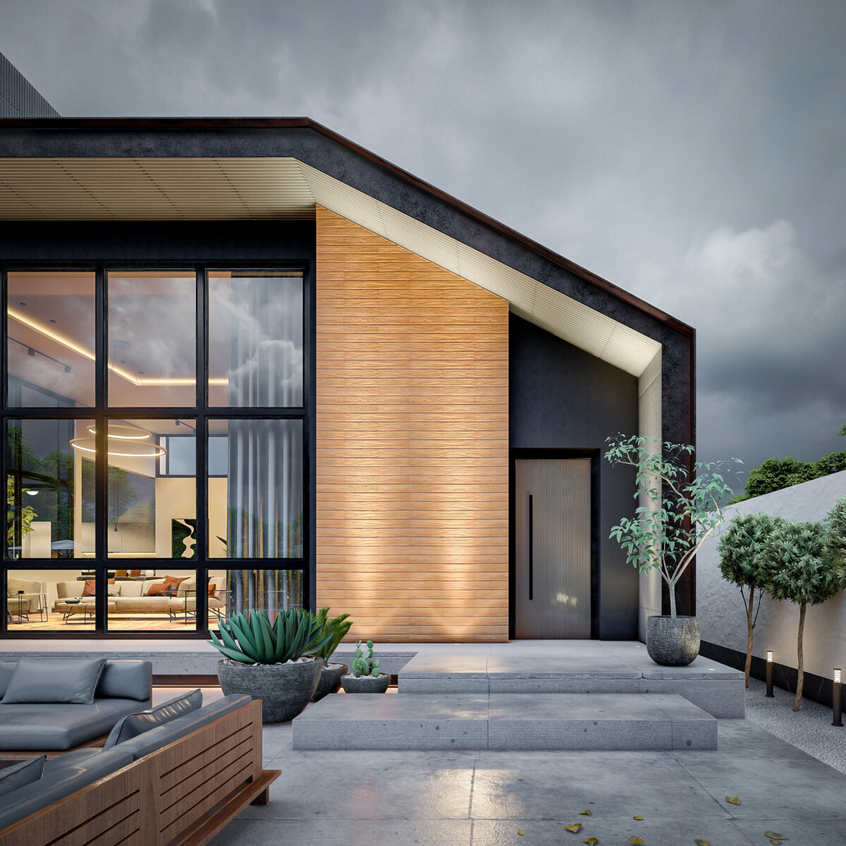 - متریال ها : تایل های بتنی طرح چوب، فلز و شیشه