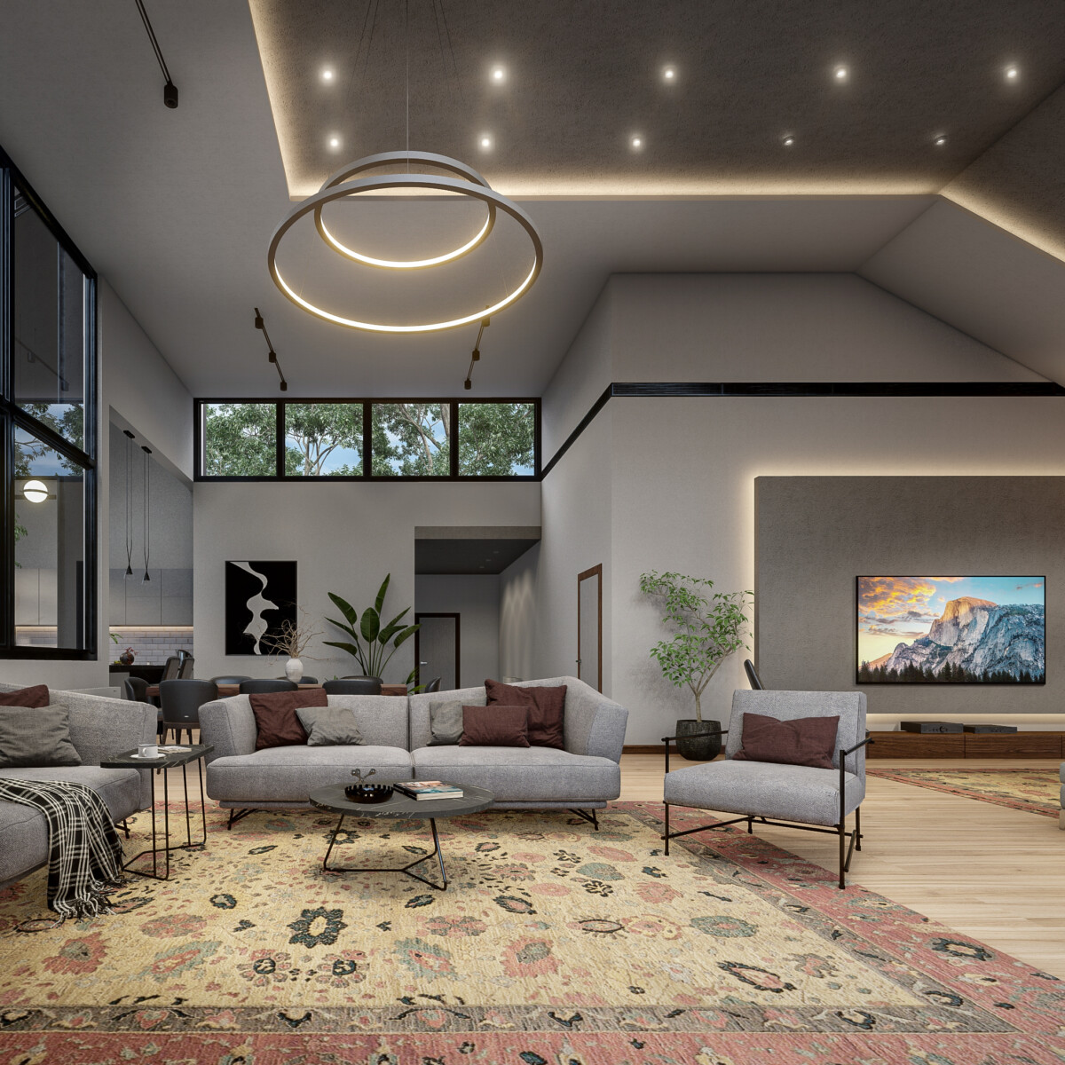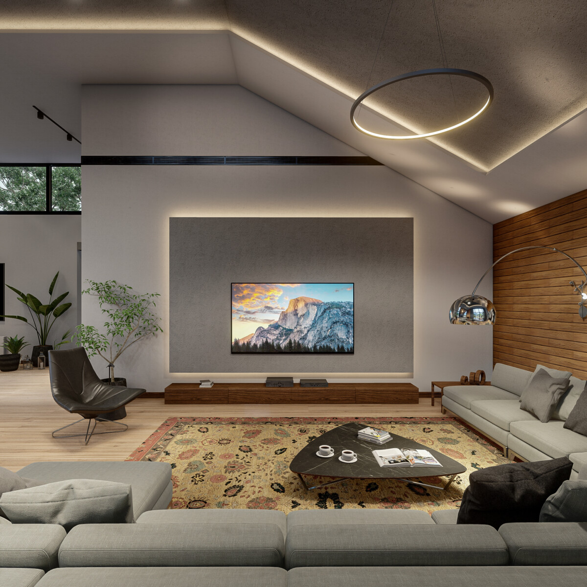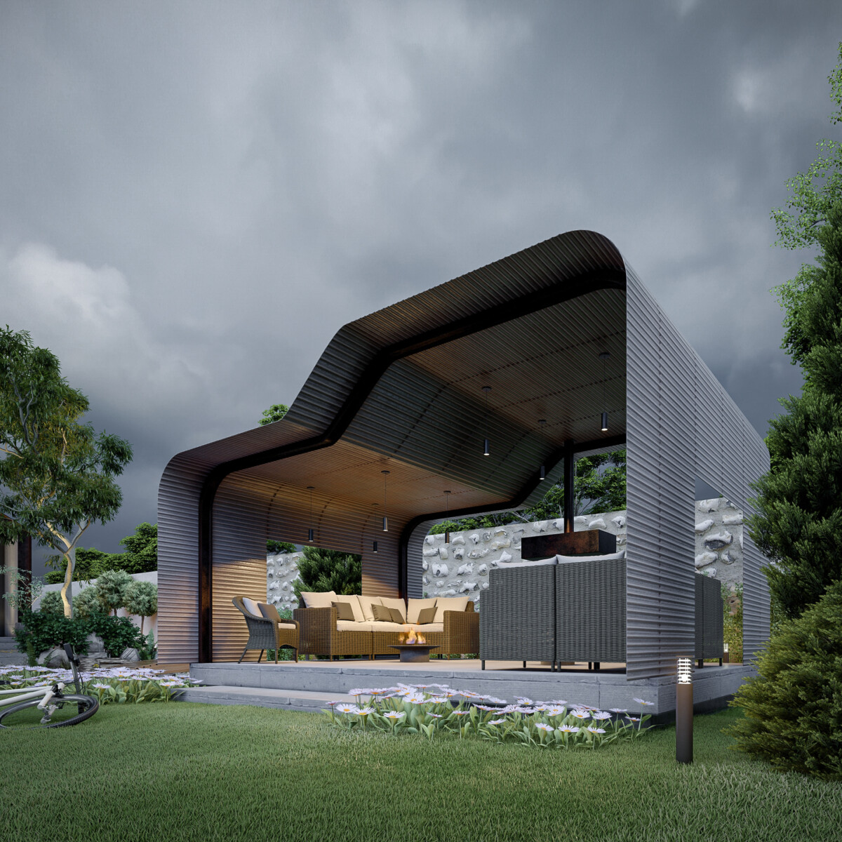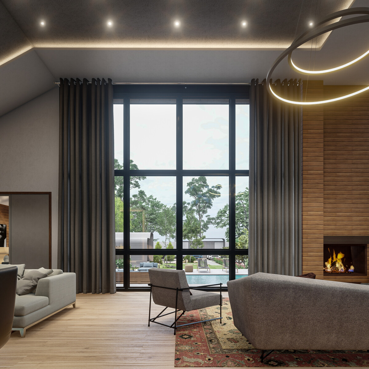 - متریال ها : تایل های بتنی طرح چوب، فلز و شیشه
